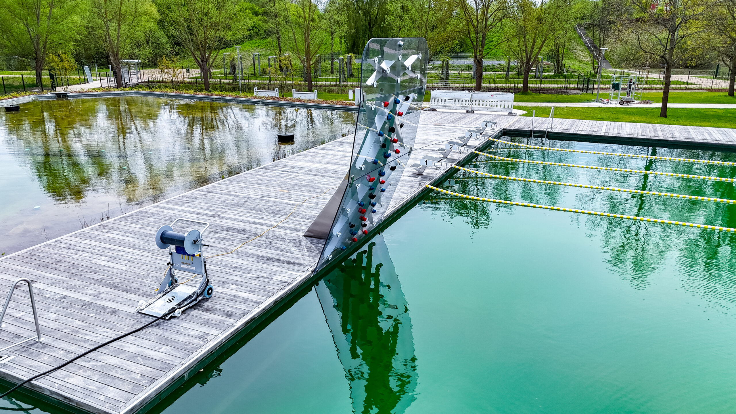 Das neu gebau­te Bad hat eine Was­ser­flä­che von ca. 3.600 m², die sich auf Sport‑, Schwim­mer- und Nicht­schwim­mer­be­cken auf­tei­len, für die der Betrei­ber um die 35.000 Bade­gäs­te pro Sai­son erwar­tet. Der an die Was­ser­flä­chen angren­zen­de Strand­be­reich umfasst 1.800 m² und die Was­ser­auf­be­rei­tung erfolgt mit bio­lo­gi­scher Was­ser­rei­ni­gung gemäß der FLL-Richt­li­nie, unter Ein­satz einer Hydro­bo­ta­nik sowie eines Nep­t­un­fil­ters. Mit einer 66 kWp Pho­to­Vol­ta­ik-Anla­ge auf dem Dach des Gas­tro­no­mie­ge­bäu­des, einer Wär­me­pum­pe, inte­grier­ter Wär­me­rück­ge­win­nung und dem Ein­satz mög­lichst effi­zi­en­ter Pum­pen wird das Bad dezen­tral betrie­ben. Im Regel­be­trieb ent­steht ein Über­schuss an Ener­gie, mit dem zusätz­lich Elek­tro­la­de­säu­len betrie­ben und die Strom­spei­cher befüllt wer­den kön­nen. Die Steue­rung des Bades erfolgt dyna­misch. So wer­den die Pum­pen für den Schwimm­be­trieb bei Schlecht­wet­ter auto­ma­tisch in der Leis­tung redu­ziert.