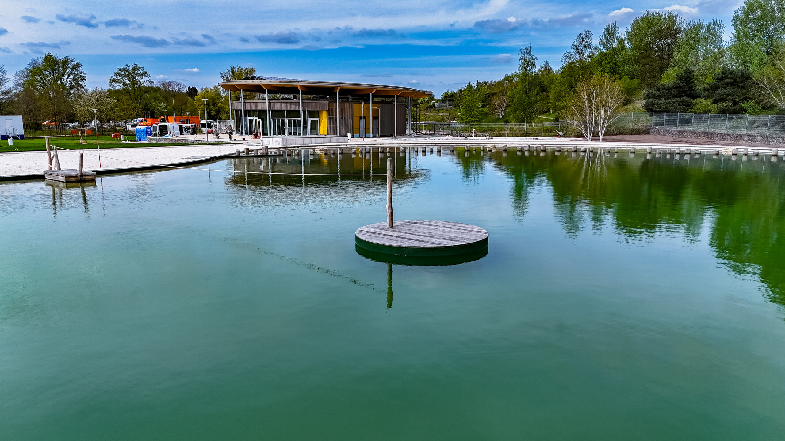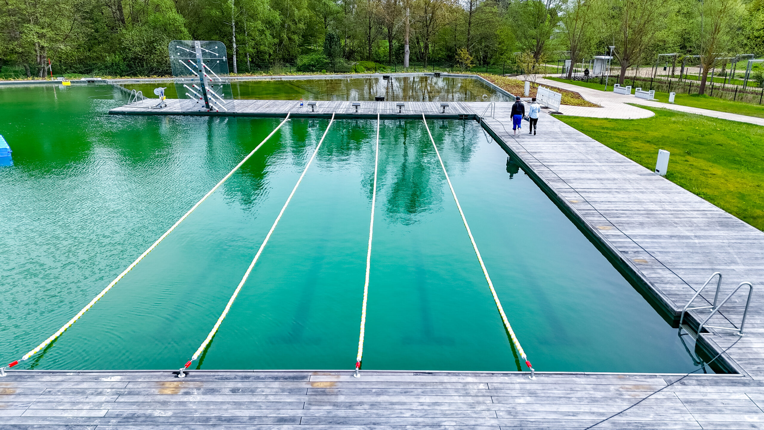 Nach einer Bau­pha­se von rund 18 Mona­ten und trotz eines Brand­scha­dens am Sani­tär- und Gas­tro­no­mie­ge­bäu­de konn­te im Mai 2025 das Natur­frei­bad im Ecker­mann­park in Win­sen (Luhe) in Betrieb genom­men wer­den. Das ambi­tio­nier­te Ziel des Neu­baus – kli­ma­neu­tra­ler Betrieb.