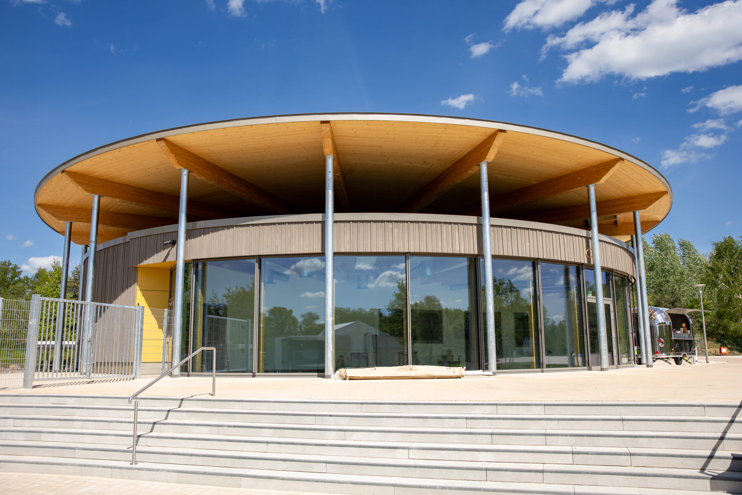 Nicht nur der Bäder­bau und die Was­ser­tech­nik wur­den im Natur­frei­bad Win­sen mit Blick auf die Nach­hal­tig­keit opti­miert, auch der Hoch­bau folg­te die­ser Prä­mis­se. Das Funk­ti­ons­ge­bäu­de mit Gas­tro­no­mie­be­trieb, Sani­tär­an­la­gen und Betriebs­räu­men sieht durch die kreis­för­mi­ge Bau­wei­se und das flie­gen­de Dach nicht nur inno­va­tiv aus, son­dern ist auch res­sour­cen­scho­nend in Holz­stän­der­werk-Bau­wei­se gebaut. Als Beson­der­heit besteht außer­halb der Bade­sai­son die Mög­lich­keit, über Wär­me­pum­pen die Wär­me aus dem Bade­see zu nut­zen, um das Gebäu­de zu hei­zen. So kann auch ein Teil der für die ganz­jäh­ri­ge Nut­zung des Gebäu­des benö­tig­ten Ener­gie direkt vor Ort gewon­nen wer­den. Durch den Brand­scha­den am Funk­ti­ons­ge­bäu­de wird eine Bewer­tung der tat­säch­li­chen Ener­gie­ge­win­nung und Bedar­fe erst im Anschluss an die Sai­son 2026 mög­lich sein.