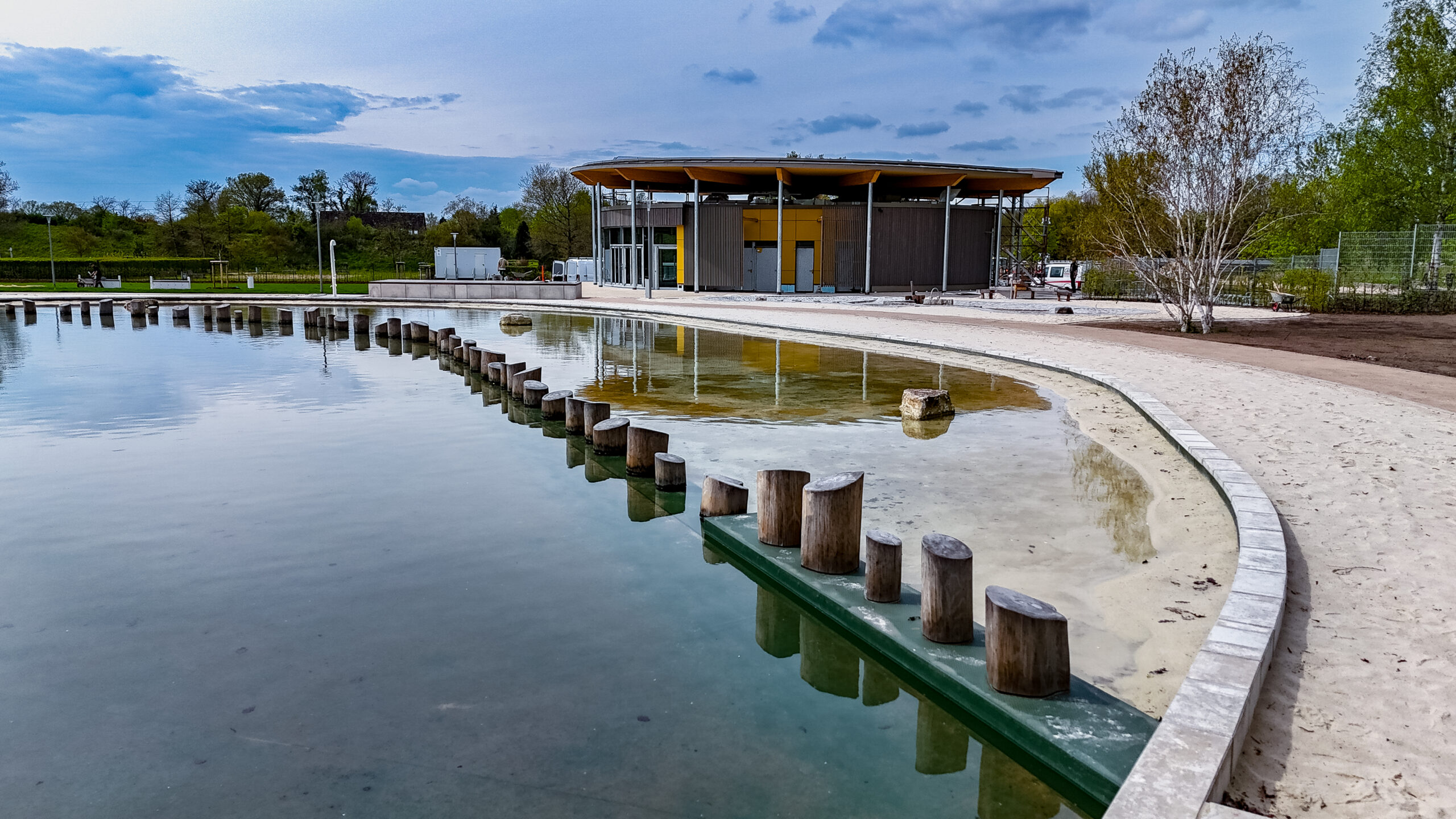 Eben­so aus­schlag­ge­bend für die Nach­hal­tig­keit, wie der Betrieb eines Bades, ist der Bau des­sel­ben, in Bezug auf Boden und Grund­was­ser sowie die ver­wen­de­ten Bau­stof­fe. Erhöh­te Anfor­de­run­gen waren im Ecker­mann­park durch die unmit­tel­ba­re Nähe zum geschütz­ten Auen­ge­biet der Luhe gege­ben, des­sen Grund­was­ser­re­gime durch die Bau­maß­nah­men nicht beein­träch­tigt wer­den darf. Um das zu gewähr­leis­ten, wur­de der Was­ser­spie­gel der Becken über das Gelän­de­ni­veau ange­ho­ben und die Aus­hub­tie­fen mini­miert. Bei der Aus­wahl der Bau­stof­fe für die Gestal­tung der Becken und Frei­raum­an­la­gen wur­de ein Augen­merk auf die größt­mög­li­che Redu­zie­rung von Beton als sehr ener­gie­in­ten­si­ver Bau­stoff gelegt. Der Ansatz bau­tech­nisch neue Maß­stä­be zu set­zen, konn­te nicht in allen Berei­chen zur Umset­zung kom­men, wie bspw. die Aus­bil­dung der Beckens­oh­le mit Schaum­glas­plat­ten, die als öko­lo­gi­sche Alter­na­ti­ve zu Beton wäh­rend der Pla­nungs­pha­se einem Eig­nungs­test unter­zo­gen wur­den. Per­spek­ti­visch liegt im Bereich der Bau­tech­nik, durch die Wei­ter­ent­wick­lung öko­lo­gi­scher Bau­stof­fe, ein gro­ßes Poten­ti­al für Opti­mie­run­gen und Ein­spa­run­gen an Res­sour­cen und umwelt­re­le­van­ten Emis­sio­nen.