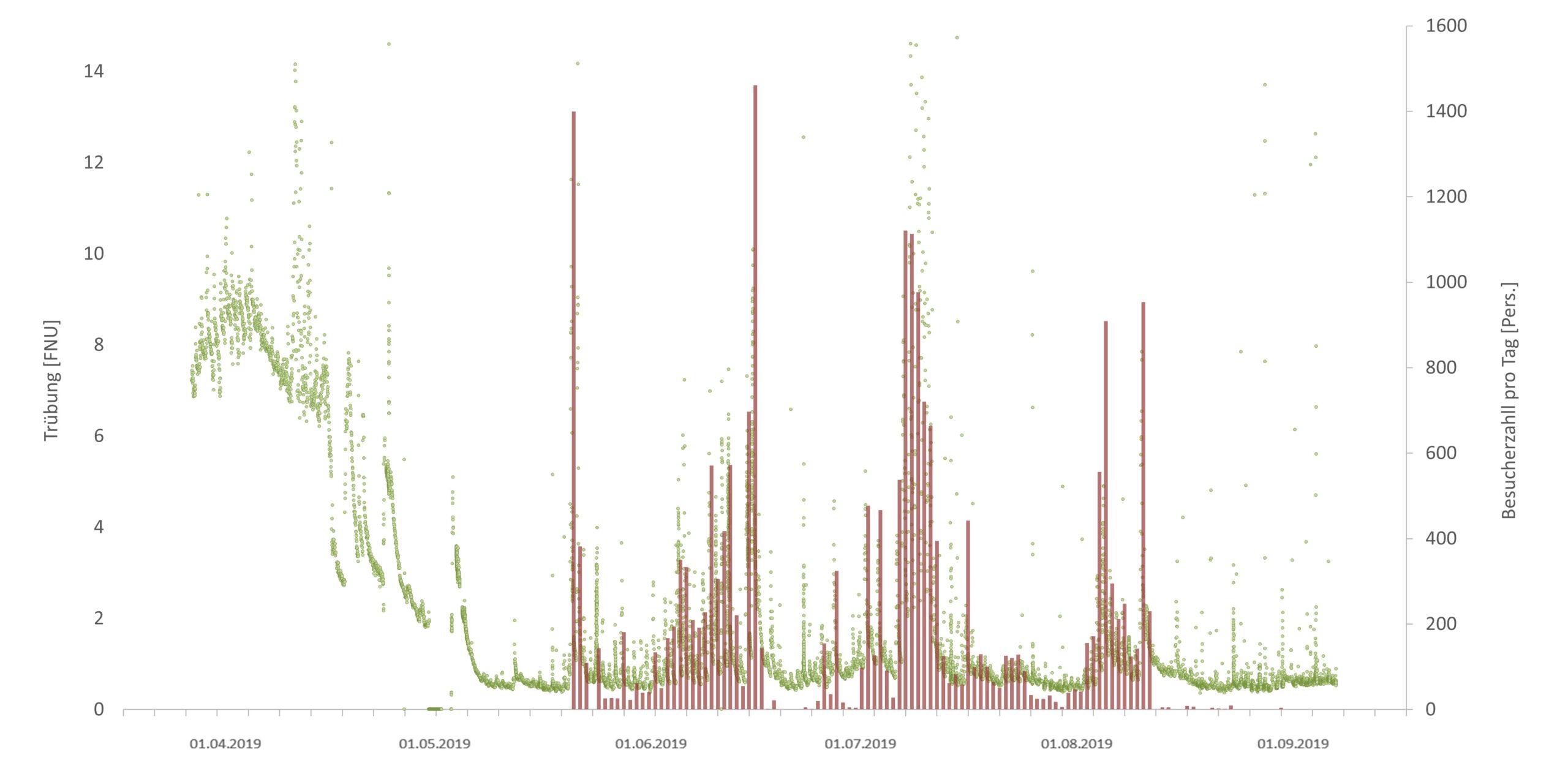 Abbildung 1: Trübung und Besucherzahlen in einem der untersuchten Bäder als Beispiel für die verwendeten Rohdaten.