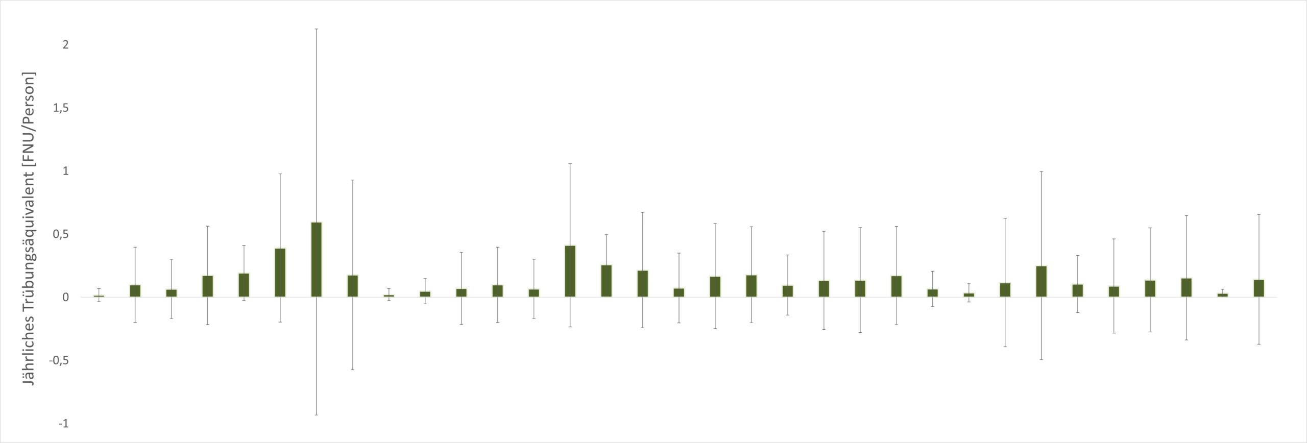 Die Standardabweichung der Rohdaten betrug im Mittel 0,37 und variierte stark zwischen 0,03 und 1,5, was auf eine hohe Heterogenität der Einzelwerte sowie eine variable und stark gestreute Datengrundlage hinweist. Zieht man den Mittelwert aller jährlichen Trübungsäquivalente für eine Plausibilitätsprobe heran, liegen die daraus errechneten Trübungswerte nicht im plausiblen Bereich dessen, was selbst in Bädern mit hoher Trübung zu erwarten wäre. Aber warum ist das so?