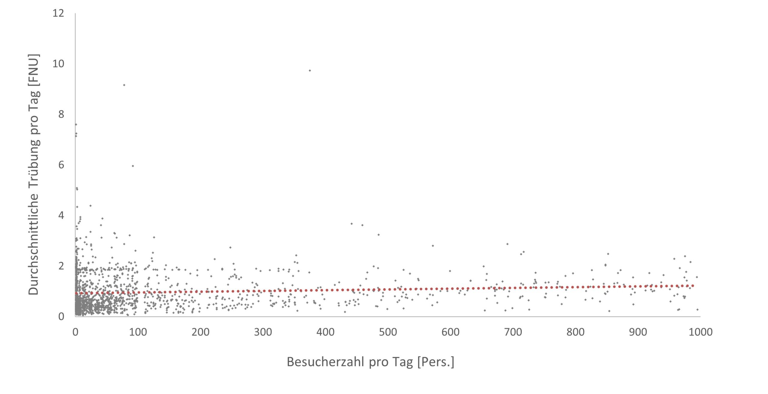 Schaut man sich die Daten an und betrachtet lediglich den Zusammenhang zwischen durchschnittlicher Trübung und Besucherzahlen pro Tag, zeigt sich nicht die deutliche Korrelation, die zunächst zu vermuten wäre. Anhand der Trendlinie in Abbildung 3 lässt sich lediglich ein leicht positiver Trend erkennen. In den meisten Bädern gibt es pro Saison nur wenige Spitzentage, an denen die Nennbesucherzahlen erreicht werden. Somit liegt die überwiegende Anzahl der Datenpunkte, und damit auch das Gros der fehlerhaften Messwerte kleiner 10 FNU, im Bereich geringerer Besucherzahlen. Der Einfluss der Messfehler ist durch diese ungleiche Datenverteilung erhöht und wirkt sich stark auf die Korrelation zwischen Trübungswerten und Besucherzahlen aus.